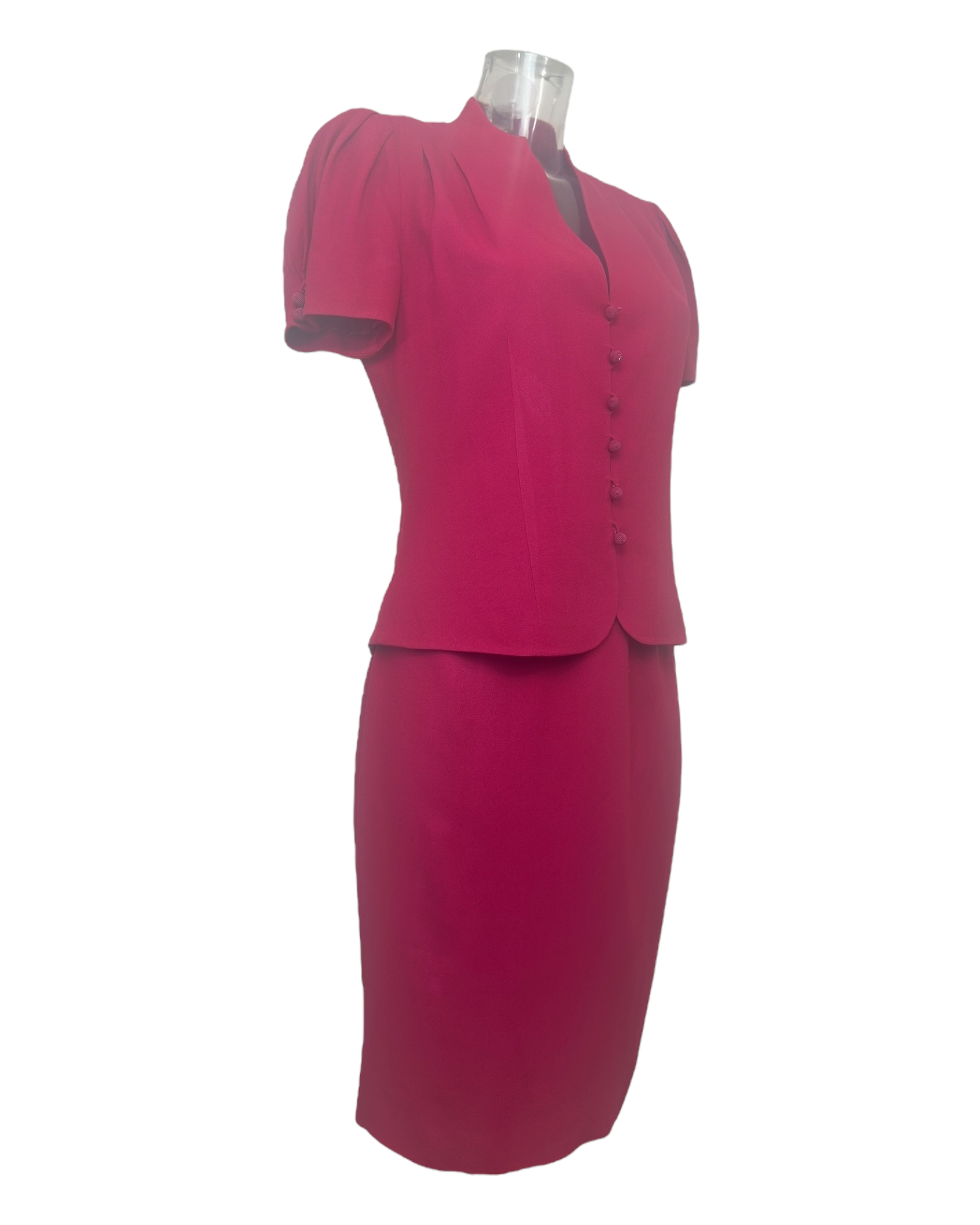 Le rose fuchsia, dense et lumineux, sublime une veste à manches courtes au col V fendu et boutons recouverts ton sur ton, assortie d’une jupe droite fendue qui prolonge la ligne avec précision.