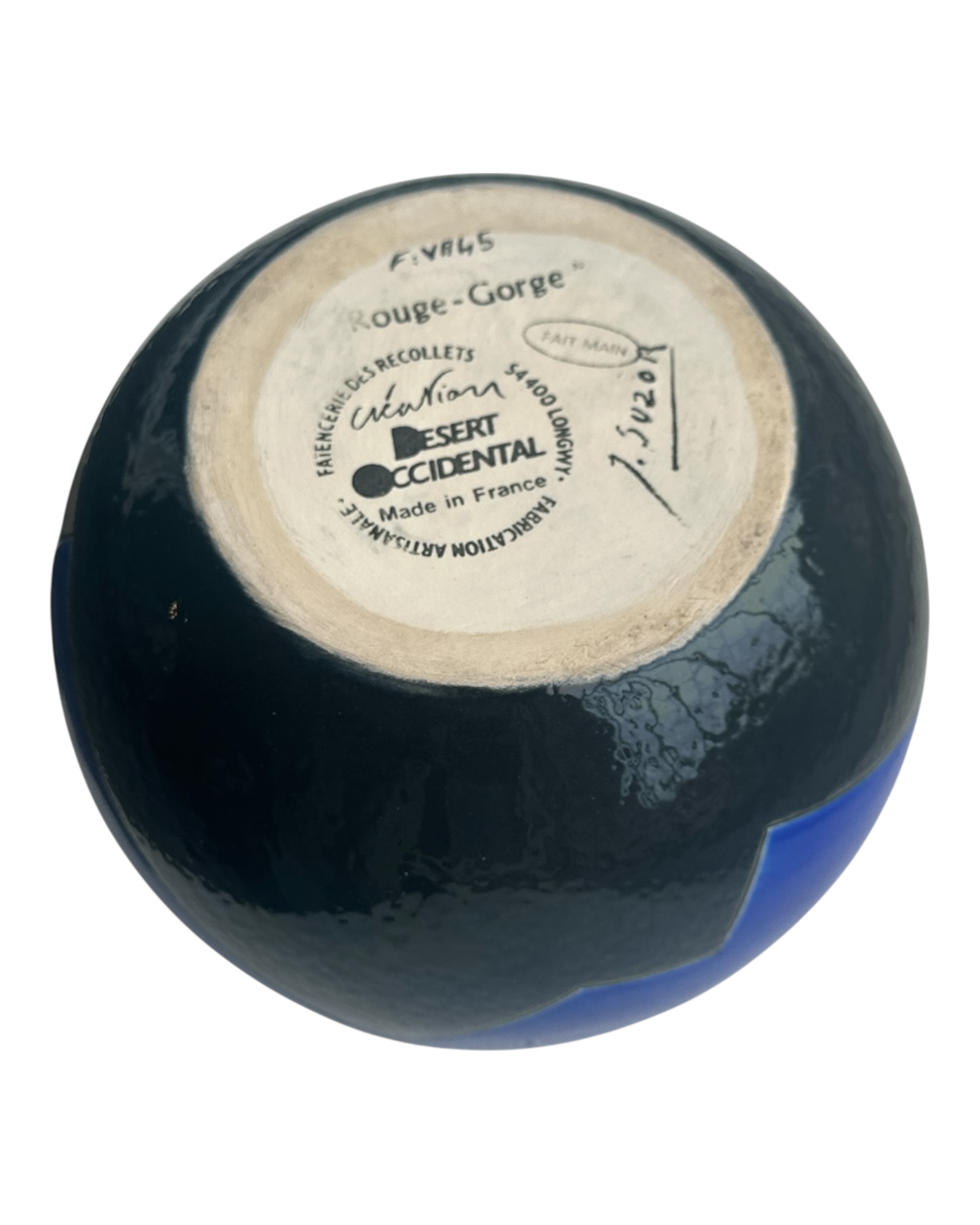 🖤 DÉSERT OCCIDENTAL – Vase Moderniste en Céramique – Signé J. Suzor – Émail Craquelé Gris & Ligne Bleue Graphique – Fait Main – Atelier des Récollets – Code FVR45
