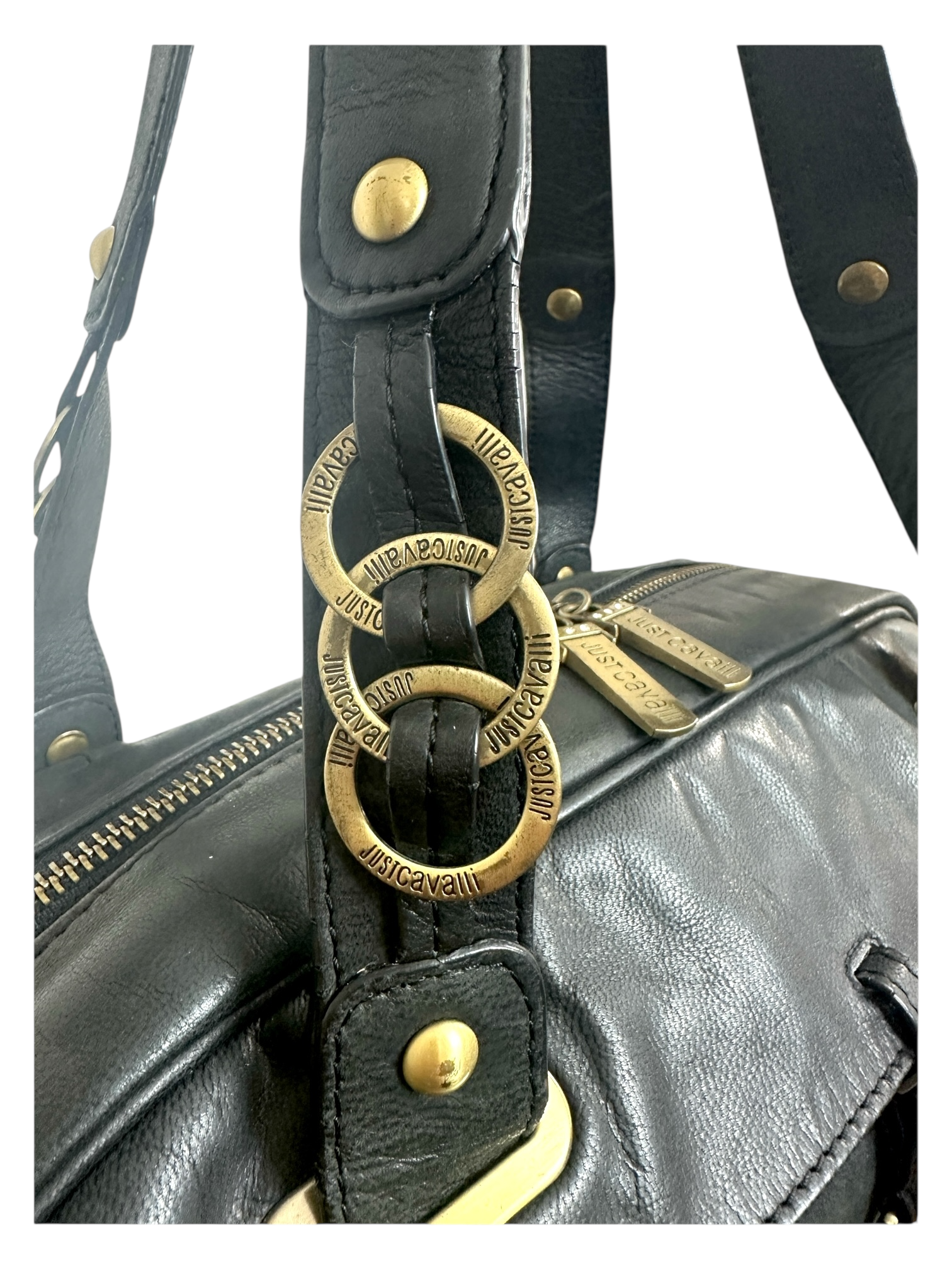 Just Cavalli – Sac Bowling – Cuir Noir & Métal Doré – Made in Italy