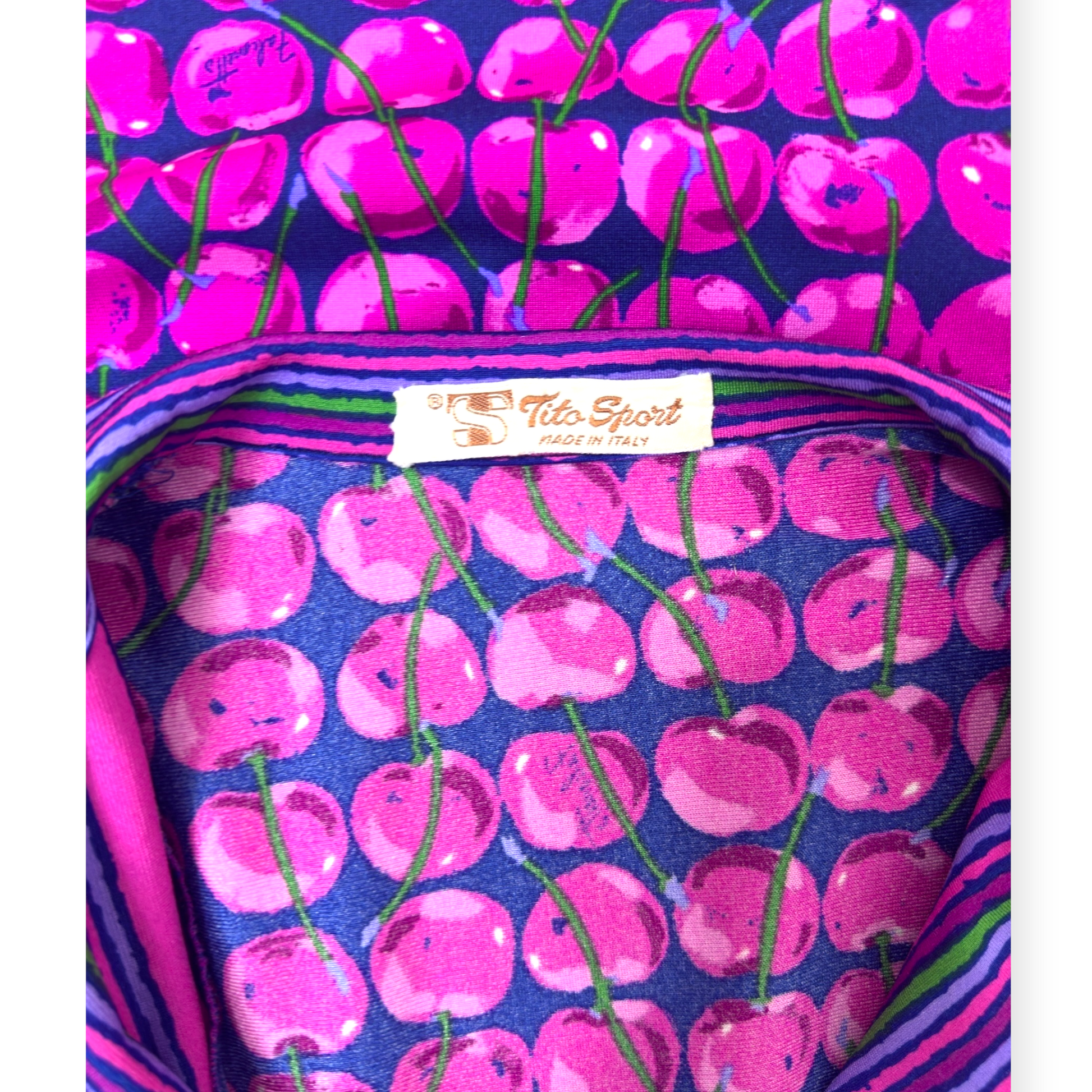 Confectionnée en pure soie, cette pièce se distingue par son imprimé exclusif de cerises fuchsia sur fond bleu profond, rehaussé de détails rayés au col et aux manches.