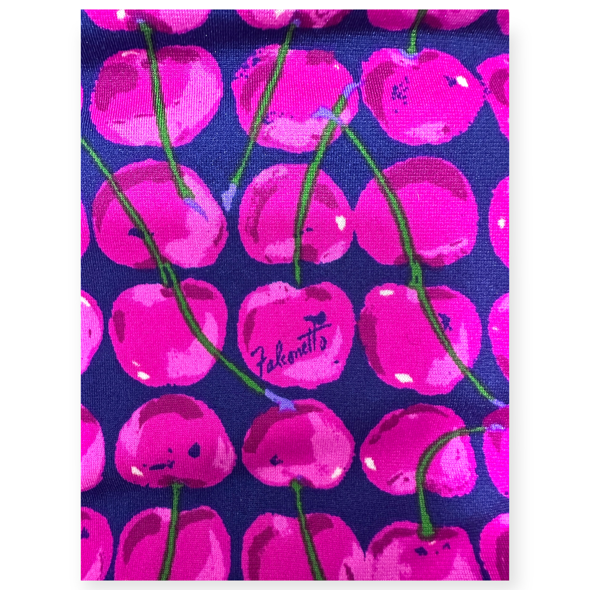 • Imprimé : Cerises fuchsia sur fond bleu, rayures multicolores au col et aux manches