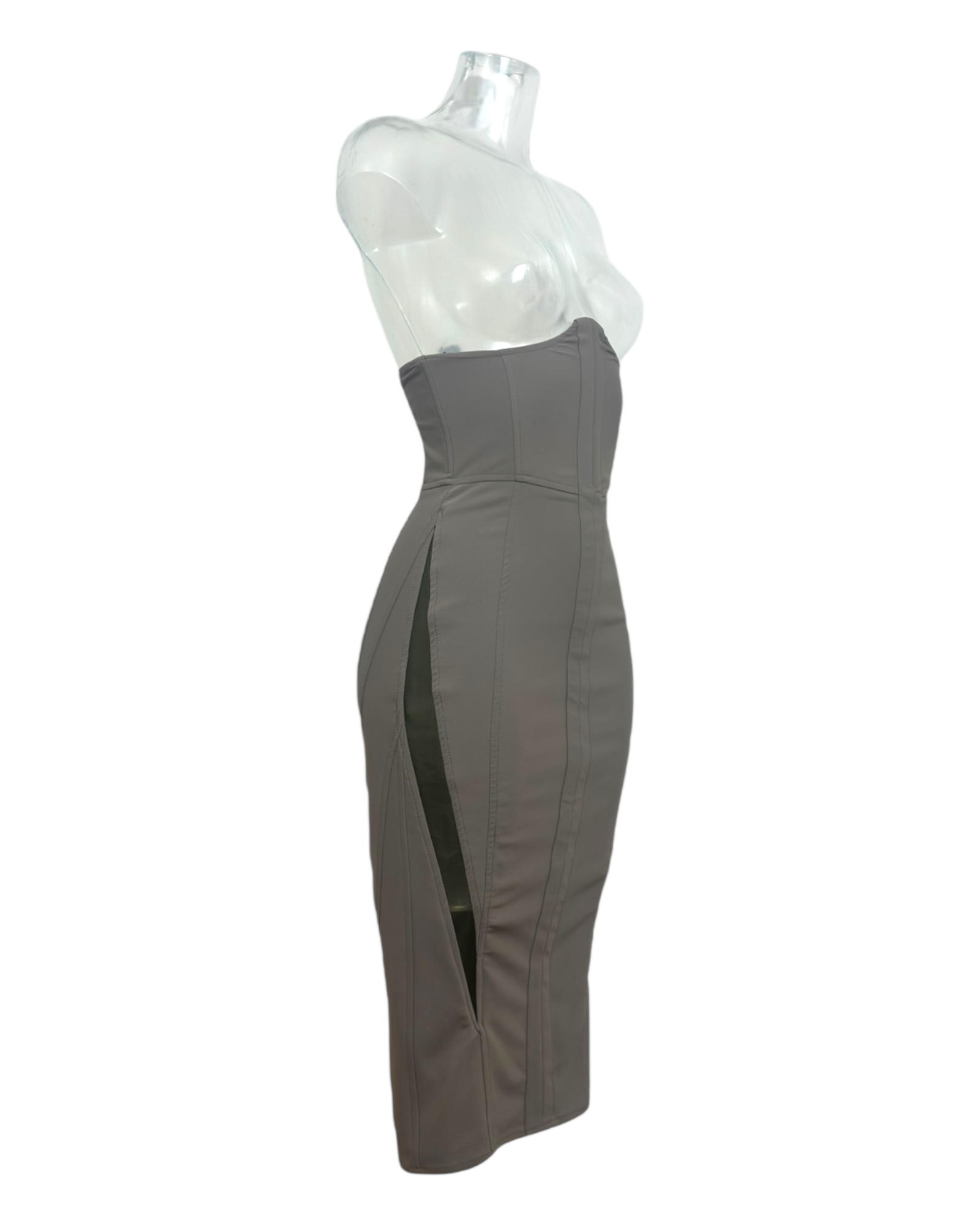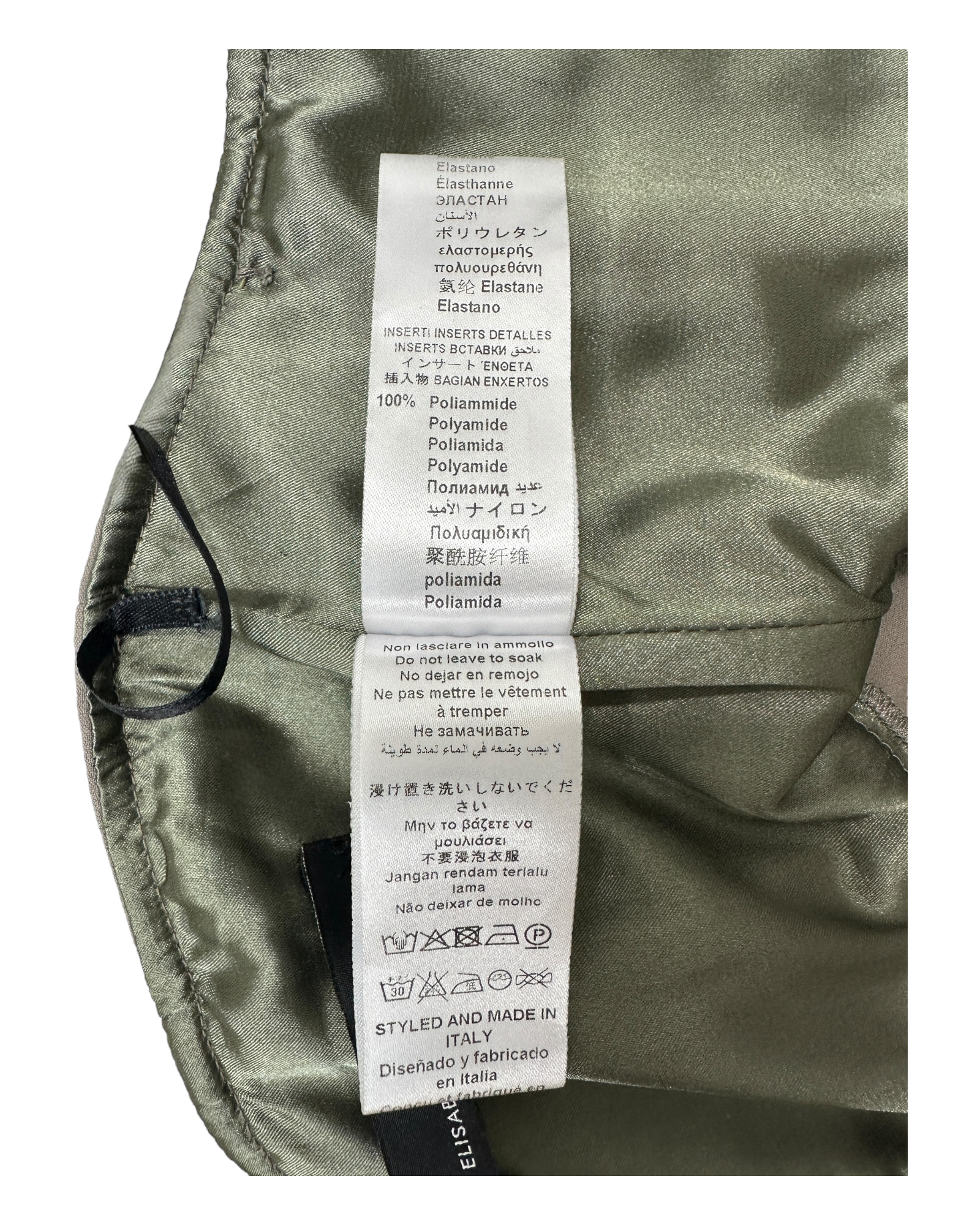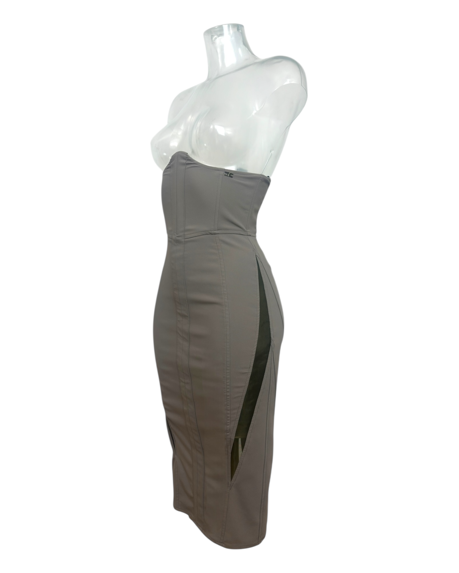 Chez Elisabetta Franchi, la silhouette est une affaire de stratégie. Cette jupe bustier corsetée en est la démonstration : une pièce hybride qui monte jusqu’au-dessous de la poitrine, structure le buste, affine la taille et impose une ligne. Le gris taupe légèrement métallisé joue la neutralité sophistiquée, tandis que les inserts en mesh noir triangulés injectent une tension visuelle maîtrisée.