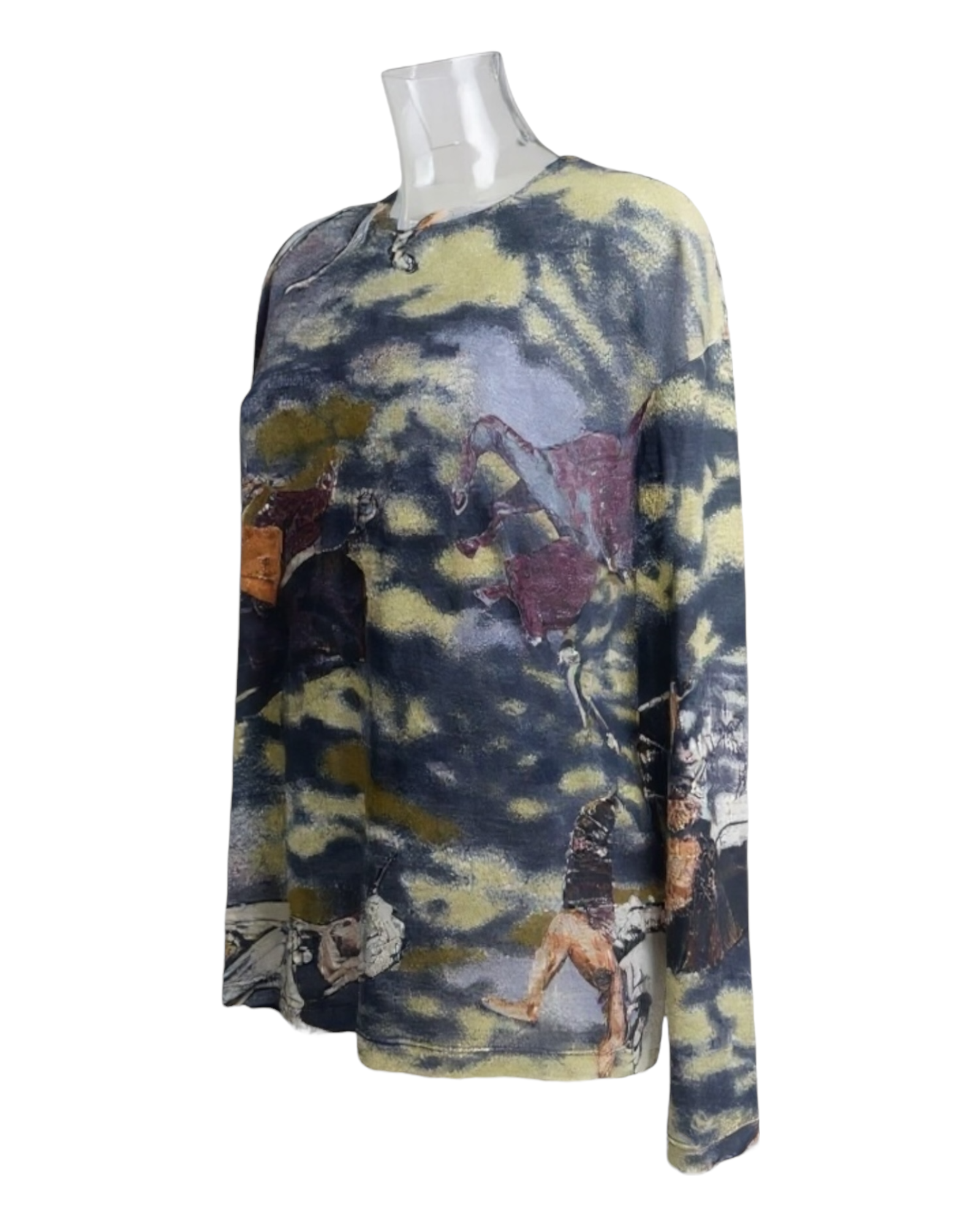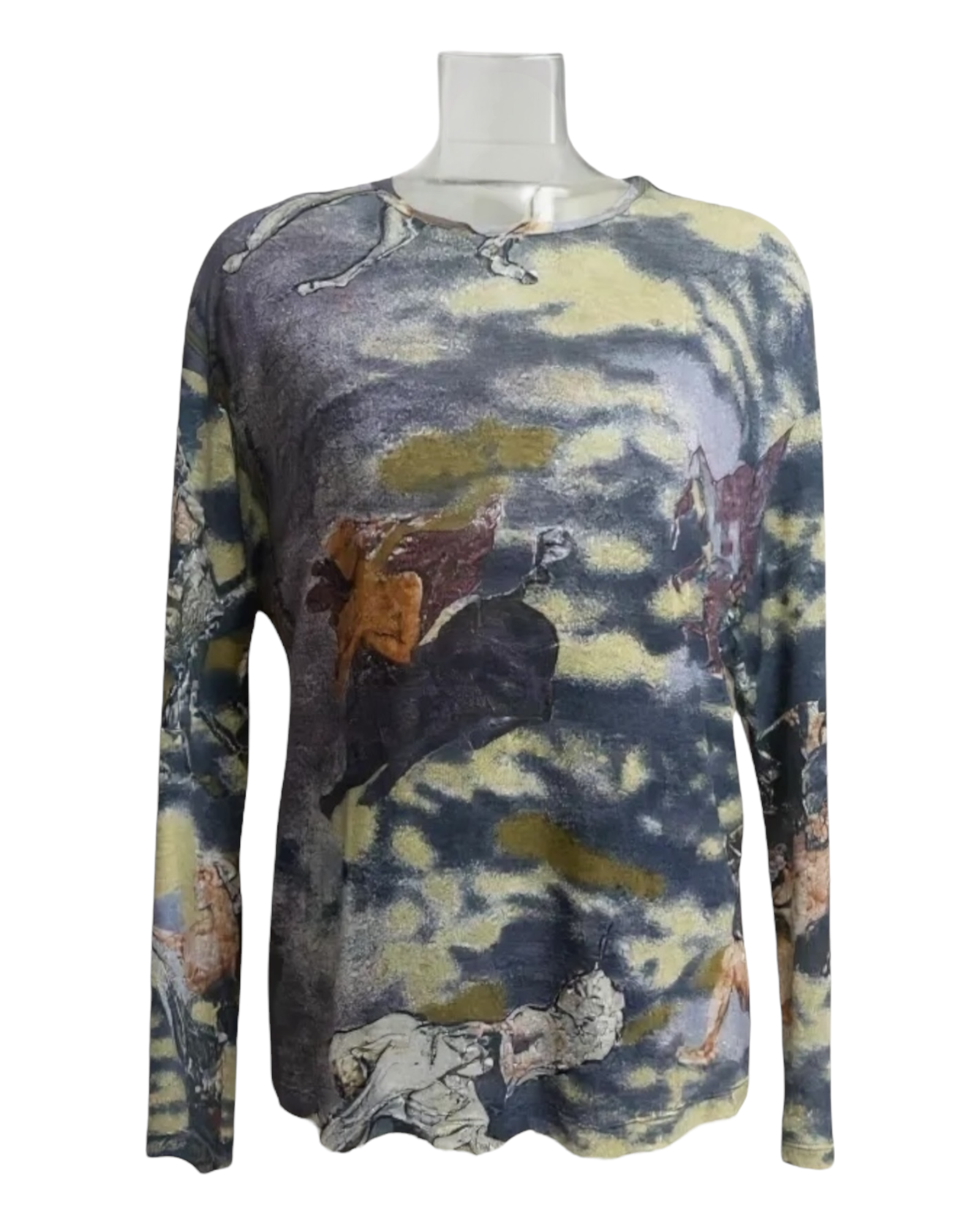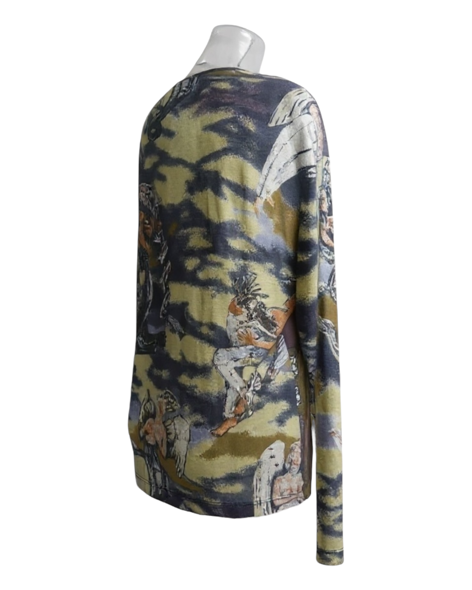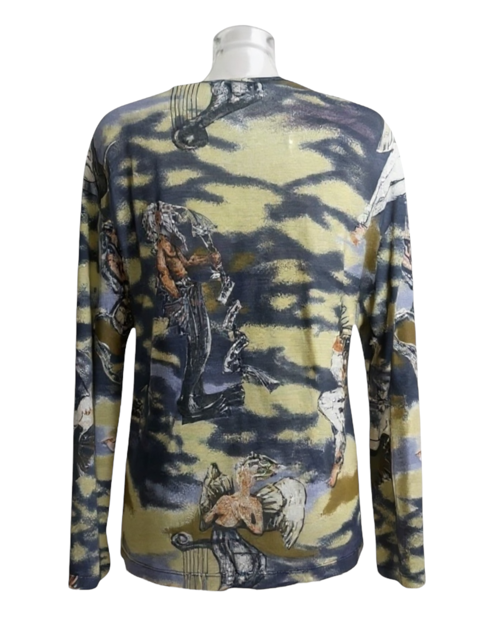 Sculptural, narratif, et pensé comme une œuvre à porter : ce haut rare de la ligne Maillaparty incarne l’audace créative de Marithé + François Girbaud au début des années 90. Intitulé Methamorphojean, il présente une fresque textile où douze figures mythologiques s’entrelacent dans une composition visuelle inspirée du zodiaque. Chaque personnage est une création originale, une métamorphose entre art, identité et mouvement.