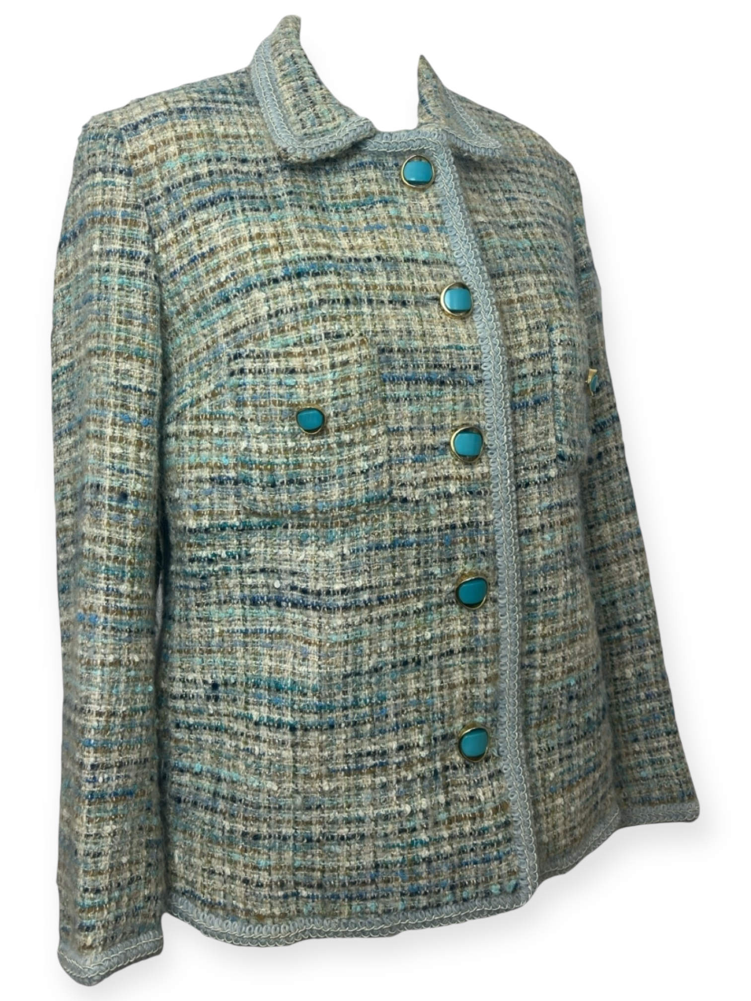 Sélection Paris Bonheur – Veste Tweed Couture – boutons turquoise– Années 70 – Made in France