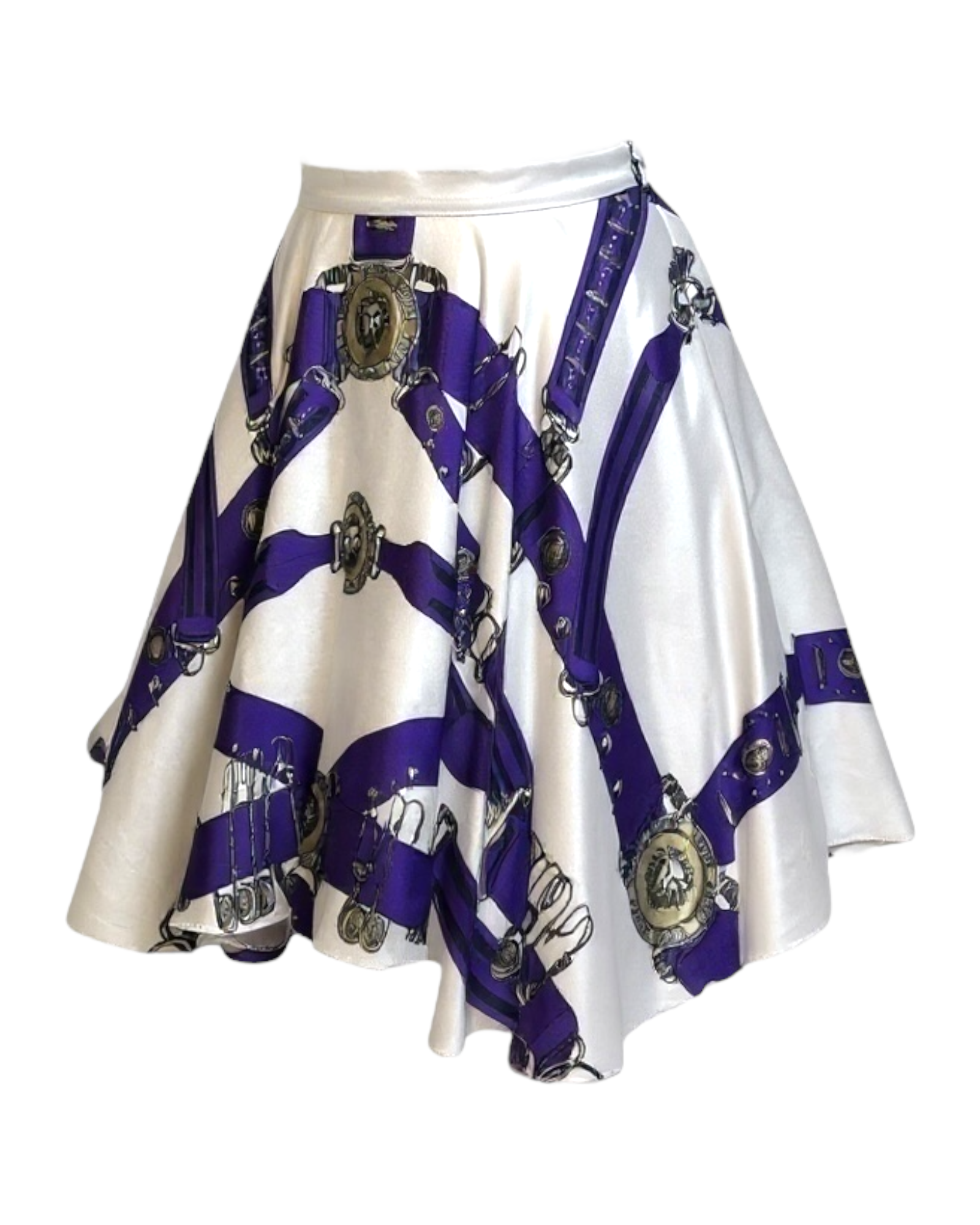 ⚫ Détails du produit : • Coupe trapèze, taille haute • Matière principale : soie imprimée • Motifs sangles, boucles et médaillons dorés • Doublure intérieure en viscose légère • Jupon en tulle intégré pour maintien du volume • Fermeture latérale invisible • Étiquette intérieure d’authenticité